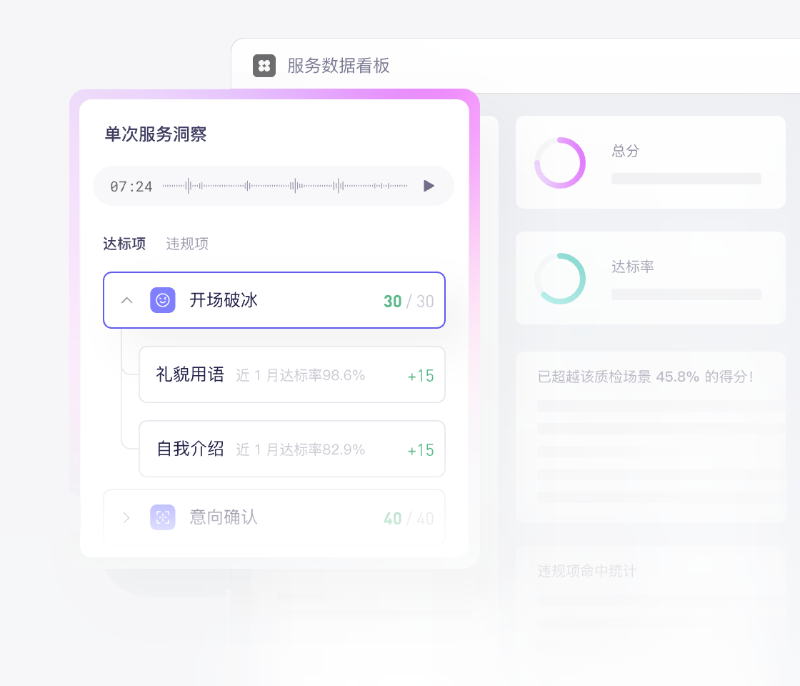 实现客户到访、销售接待、客户复访、销售跟踪、成交签约全流程的语音数据采集、质检分析服务。